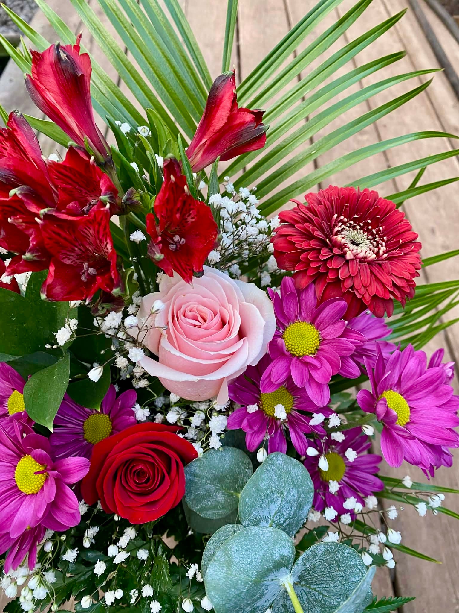 Chaque bouquet contient au minimum 1 à 2 roses, soigneusement agencées avec des fleurs fraîches de saison pour un résultat harmonieux et rempli de charme.